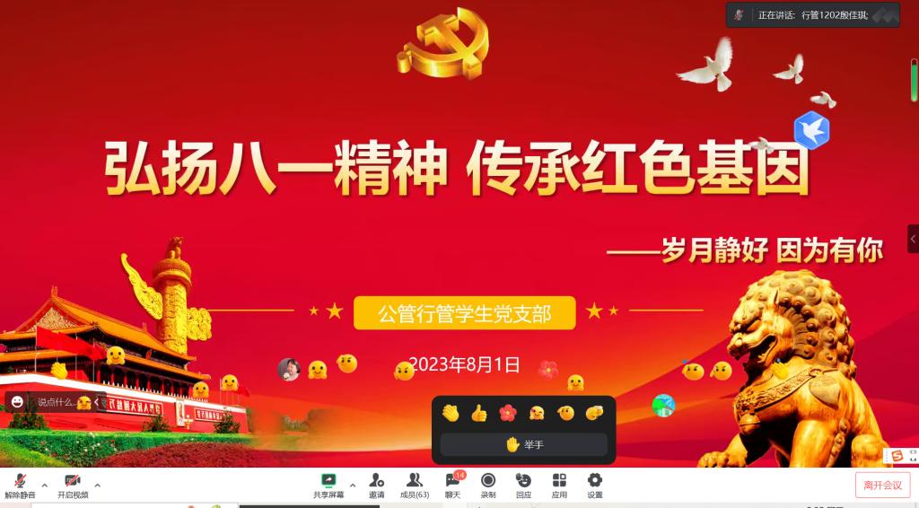 为深入开展学习贯彻习近平新时代中国特色社会主义思想主题教育,引导青年老员工学习人民解放军忠诚于党、勇于担当、无私奉献、捍卫祖国的精神,缅怀革命先烈,激发爱国热情,传承红色基因,增强党性修养,2023年8月1日上午,太阳成集团tyc151cc公管行管员工党支部通过腾讯会议形式组织开展了“弘扬八一精神,传承红色基因”主题党日活动。公司党委书记李育芳、党委副书记曾艳芳、副经理张玉强、辅导员陈晓文以及65名员工党员、发展对象和入党积极分子等参加活动。