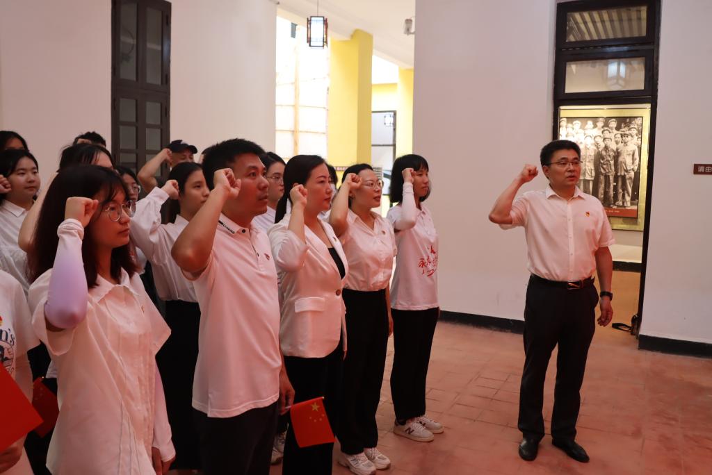 首先,一行来到中国人民解放军解放海南岛前线四十军指挥部旧址,雷州市博物馆馆长陈锐接见了一行并陪同参观。在讲解员的引导下,大家沿着“百战雄师虎踞雷城”“战前态势周密部署”“海上亮剑 勇夺琼崖”“解放海南功在海康”“不朽丰碑 光华璀璨”“百年征程 风华正茂”等六部分内容逐一参观,了解四十军解放海南岛前线的光辉历史,重温革命先辈的英雄事迹。随后,大家一起观看了纪录片,曾艳芳以“赓续红色血脉,厚植爱国情怀”为题给员工党员上党课,李育芳带领重温入党誓词。