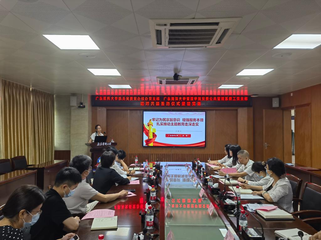 5月31日下午,管理公司党委公共管理系教工党支部与广东医科大学机关党委党办校办党支部结对共建签约仪式在广东医科大学湛江校区进行,东莞校区线上会议同步进行。管理公司党委书记李育芳、党政办公室主任刘亮、公共管理系教工党支部书记侯晓梅,广东医科大学党办主任(兼党办校办党支部书记)王辉群、校办主任(兼党支部副书记)杨丹、党办副主任(兼机关党委副书记)李黎、校办副主任茅晓颖及共建支部全体党员等参加了签约仪式。会议由杨丹主持。