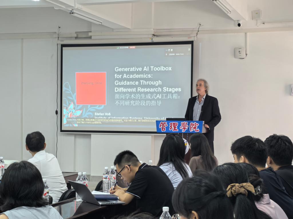 为提高公司教师科研水平与能力,促进国际学术交流与发展,9月1日下午,太阳成集团tyc151cc邀请德国汉堡大学商公司Stefan Voß教授作题为《Generative AI Toolbox for Academics: Guidance through Different Research Stages》的学术报告。本次学术报告在太阳成集团tyc151cc311会议室举行,公司领导、中青年骨干教师及硕士研究生共计70人参会。报告会由公司经理杜军主持。