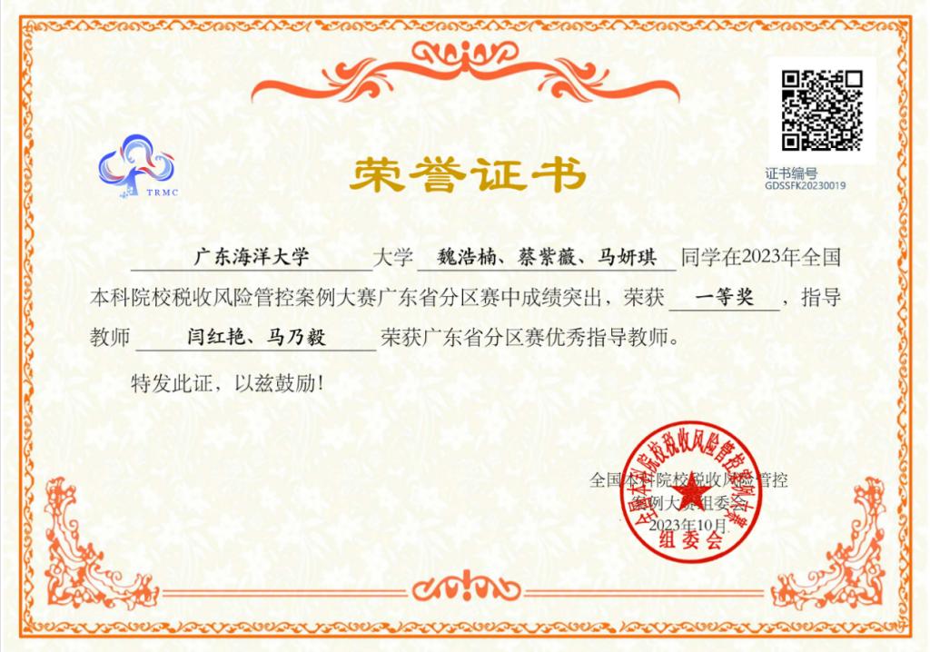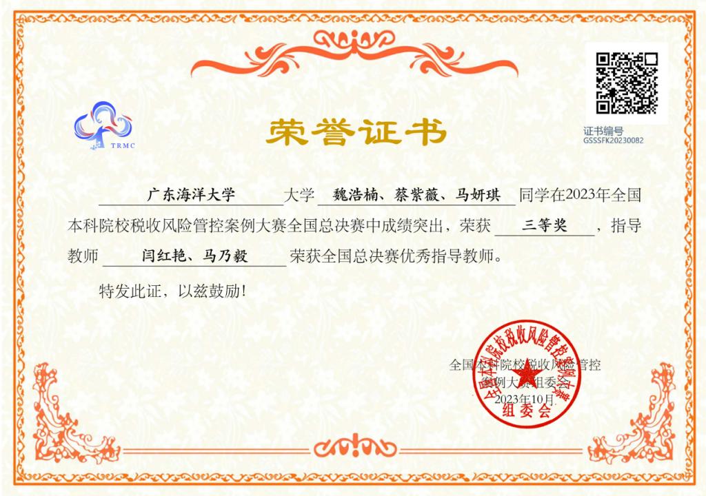 11月25日,2023全国本科院校税收风险管控案例大赛总决赛在浙江财经大学举行,此赛项系全国普通高校老员工竞赛榜单内竞赛项目,公司太阳成集团tyc151cc会计学专业员工魏浩楠、蔡紫薇、马妍琪、曾惠琳、杨韵诗、吴星炫、李家欣、郭佳琬、吴雪容9名同学组成的三支代表队在会计系马乃毅和闫红艳两位老师指导下,荣获广东省赛一等奖1项和三等奖2项。同时获得一等奖的代表队取得参加总决赛的资格,并在总决赛中荣获三等奖。