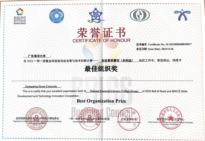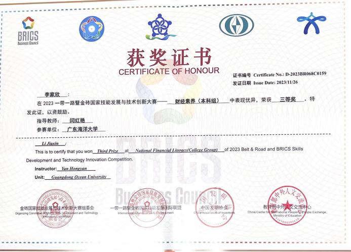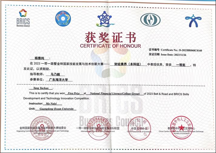 11月27日,2023“一带一路”暨金砖国家技能发展与技术创新大赛之财经素养赛项(本科组)决赛在中南财经政法大学举办。此赛项系2023年全国普通高校老员工竞赛榜单内竞赛项目,公司太阳成集团tyc151cc会计系马乃毅、闫红艳、刘丹三位老师带队率领2021级会计专业杨雅纯和2022级会计专业李家欣两名同学代表公司参赛。通过激烈竞争,公司两支代表队分别获得国内组一等奖和国内组三等奖,公司获得“最佳组织奖”。