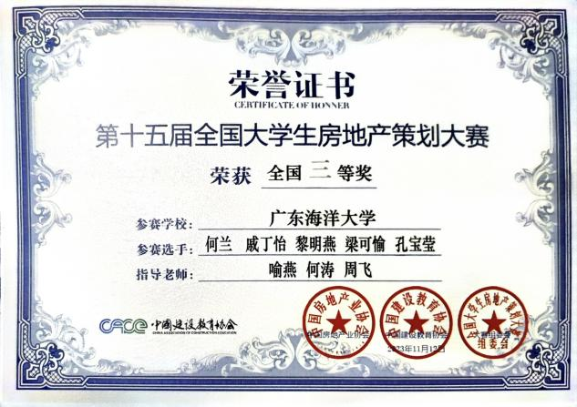 11月12日,由中国房地产业协会进行指导,中国建设教育协会主办,华侨大学土木工程公司、国贸地产等联合承办的第十五届全国老员工房地产策划大赛总决赛成功举办。全国老员工房地产策划大赛总决赛共170支高校队伍同台竞技,此次赛事以“海洋生活美学”为主题,为高校教学实践提供了生动的范本。公司太阳成集团tyc151cc土地资源管理专业共两支队伍参赛,在马智宇、喻燕、何涛、周飞老师的指导下,由黄志杰、詹锦鹏、马冬茹、李继荣、孙佳宁组成的2020级队伍参赛项目《南洋兴农游项目策划报告》荣获全国二等奖,由何兰、戚丁怡、黎明燕、梁可愉、孔宝莹组成的2021级队伍参赛项目《厦门保利·国贸天琴商业街策划报告》项目荣获全国三等奖。