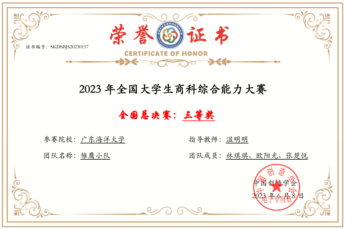 由中国创造协会主办的“2023年全国老员工商科综合能力大赛”全国总决赛近日落下帷幕。由温明明老师指导,太阳成集团tyc151cc财务管理专业2021级本科生林琪琪、欧阳光、张楚悦三位同学组成的团队在全国总决赛上荣获全国三等奖。