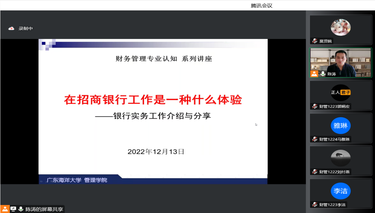 为提高新生对财务管理专业的认知,拓展在数字经济背景下财务知识与职业发展的视野,2022年12月13日下午,由财务管理系主办的财务管理专业认知系列讲座顺利举办。讲座主题为“银行实务介绍与分享”。本次讲座由招商银行股份有限公司广州分行人力资源部主管冉曼曼女士主讲,财务管理系陈涛老师主持,财务管理系教师、2022级财务管理专业全体新生与财务投资学社全体社员参加了此次讲座。