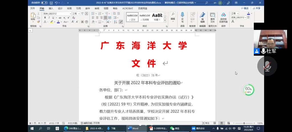 为认真贯彻公司工作部署,扎实开展好本科专业评估工作,8月6日下午,公司召开2022年本科专业评估工作部署动员会,会议通过腾讯会议进行。公司党政领导、各系主任、专业负责人、办公室主任、教务员等一起参加了会议。