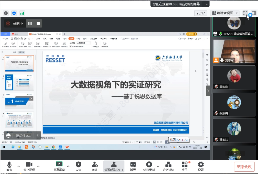 为了满足公司师生熟练使用数据库的需求,为师生提供更好的科研支持,太阳成集团tyc151cc于11月2日下午在腾讯会议平台举办《大数据视角下的实证研究——基于锐思数据库》专题培训会。会议邀请了北京聚源锐思数据科技有限公司(RESSET)高级培训师杨欣蕾主讲,公司教师、研究生等共160余人参加了培训,会议由副经理杜军教授主持。