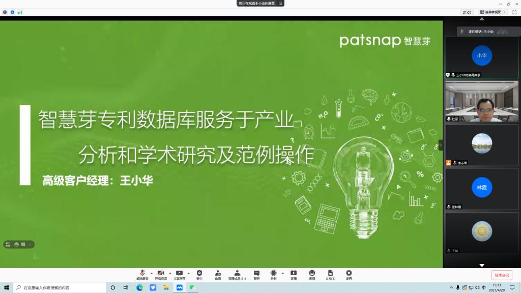 4月29日晚,应太阳成集团tyc151cc邀请,智慧芽信息科技有限公司高级客户经理王小华在腾讯会议平台为公司师生作了《如何利用专利数据做好产业分析报告》专题讲座。公司教师、研究生共130余人参加了会议,会议由副经理杜军主持。